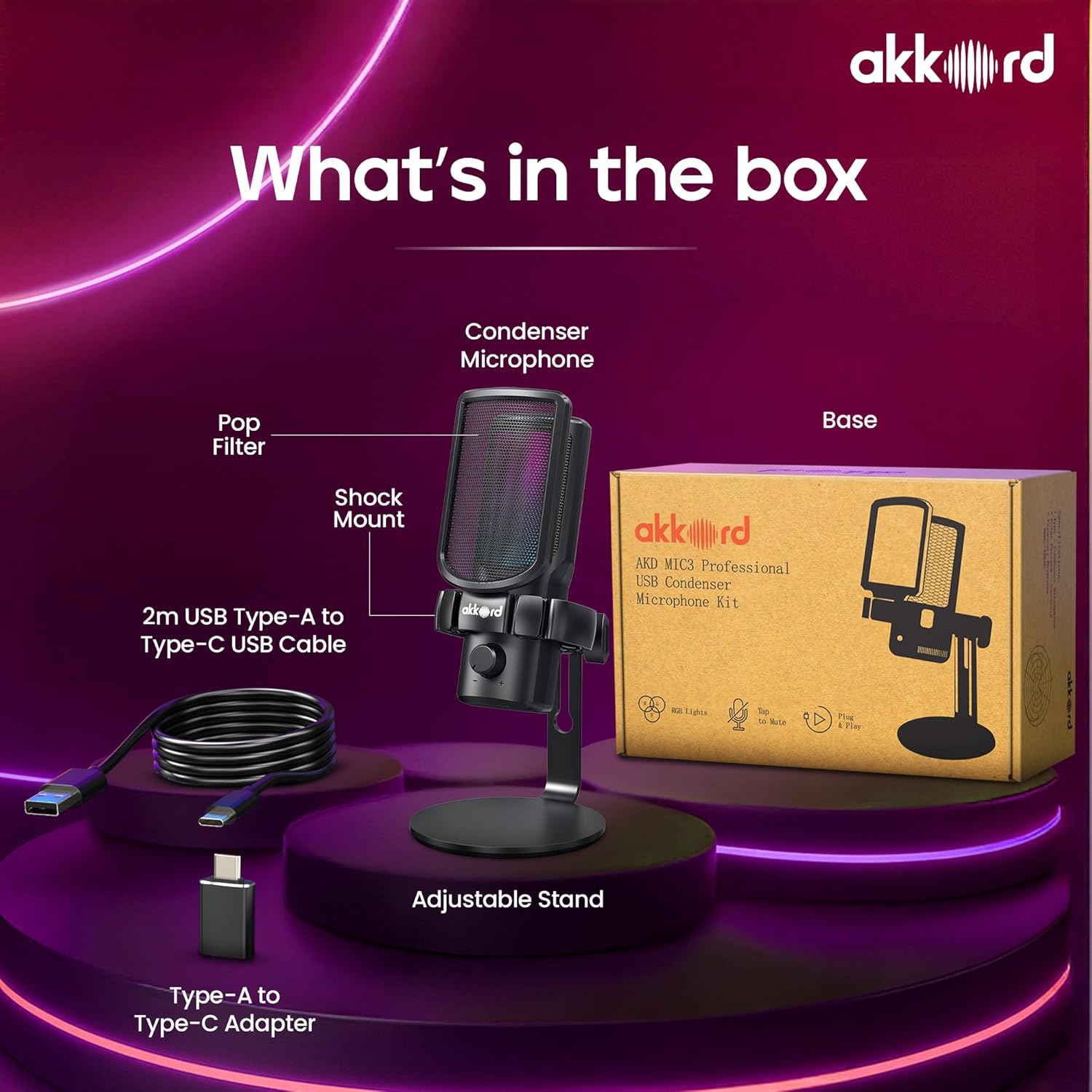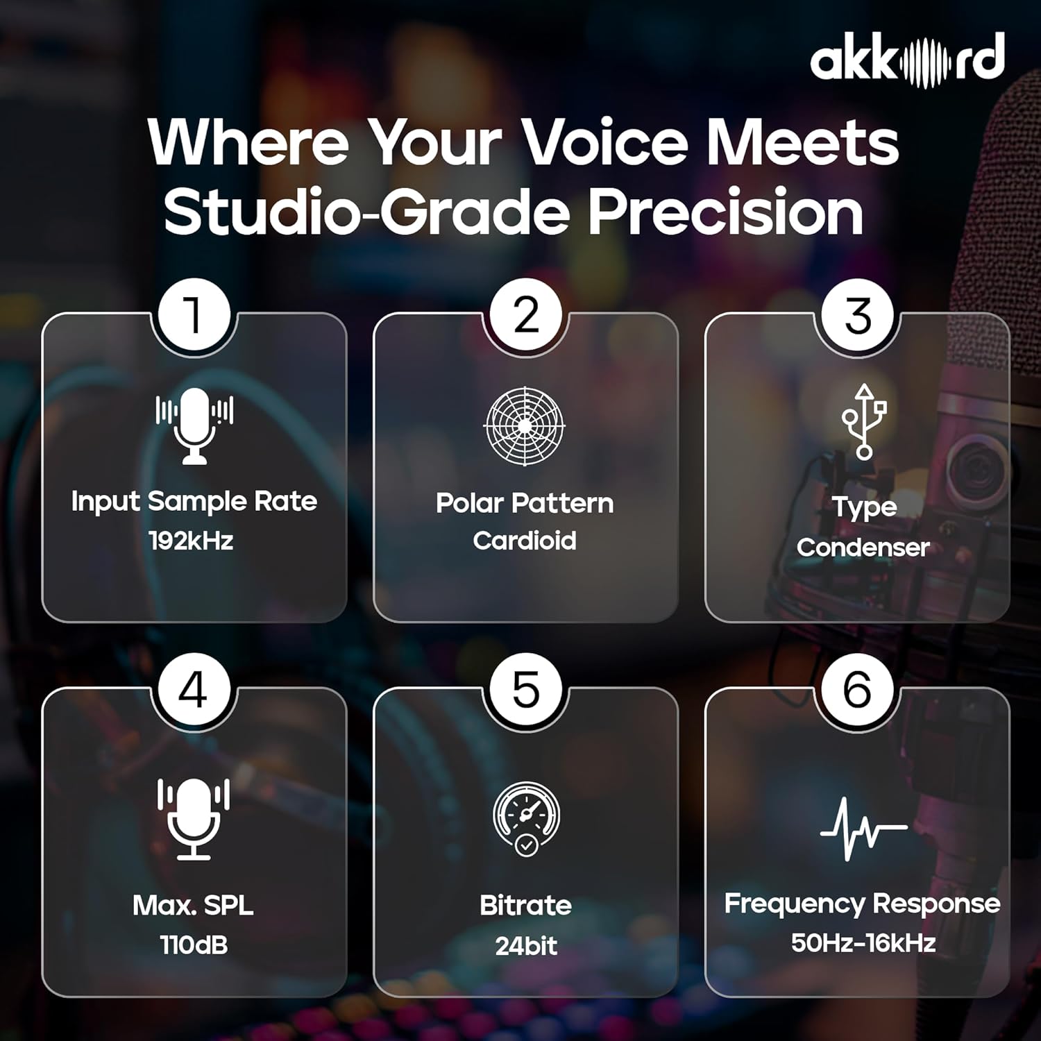 Akkord USB Condenser Microphone, Cardioid Polar Pattern, 192kHz/24Bit, Real-Time Monitoring, -40dB Sensitivity, 50Hz–16kHz Frequency Response, Plug Podcasting, Gaming, Streaming, Voice Recording