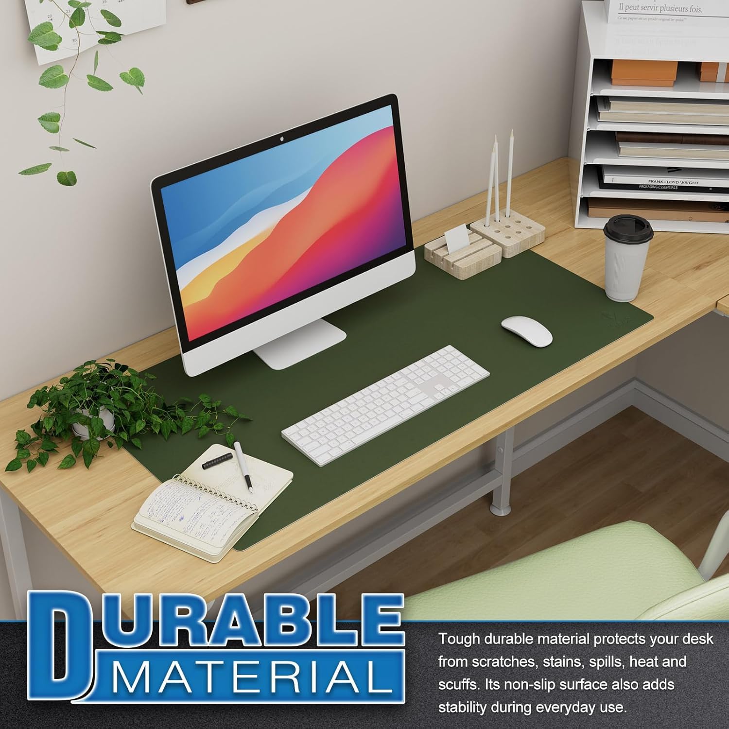 Large Desk Mat Dimensions: Measuring 35.4 x 17.7 inches, (90 x 45 cm) and Color: Deep Green & Grey, with a 0.2cm thickness, this oversized mouse pad provides ample space for laptops, keyboards, and mice. Made from durable vegan leather, it protects your desk from scratches, stains, heat, and spills while offering a professional two-tone reversible design in Navy Blue and Yellow.