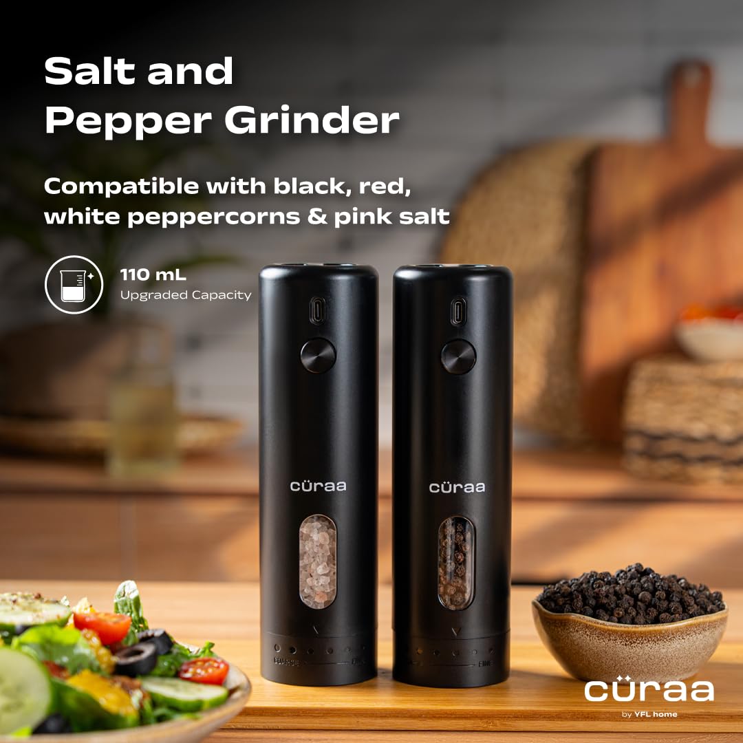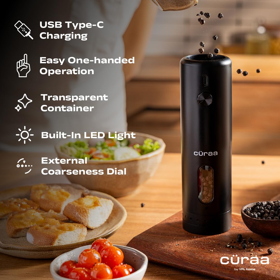 Cüraa by YFL home Rechargeable Electric Salt and Pepper Mill is made from safe, food-grade material and has ceramic grinders for smooth and easy grinding.