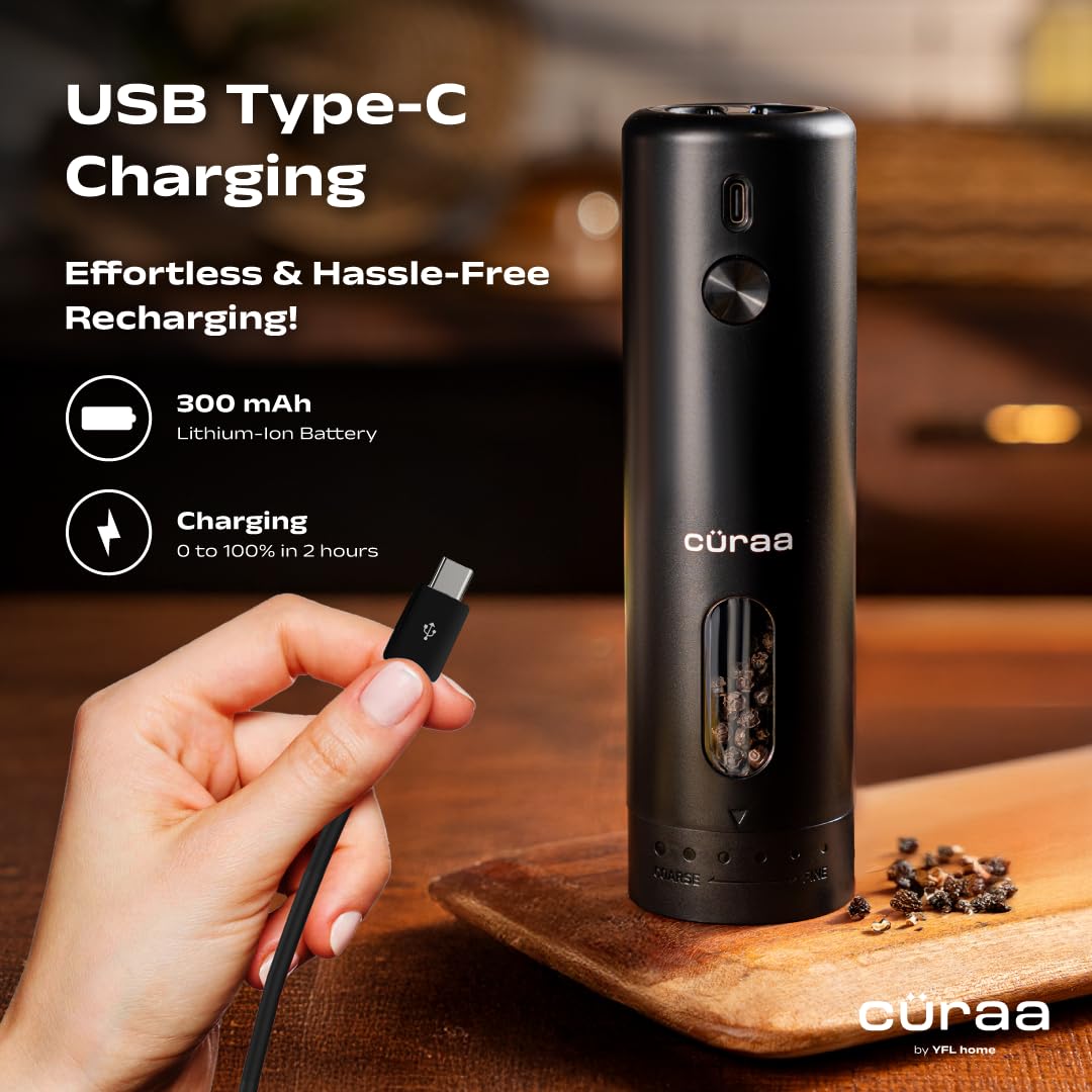 Hassle-Free Refilling | USB Type-C Charging – Cüraa by YFL home Electric Pepper Mill Powers up fully in 2 hours and delivers up to 15 minutes of smooth with continuous grinding.