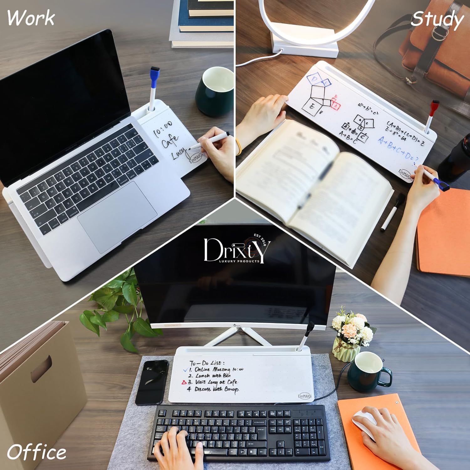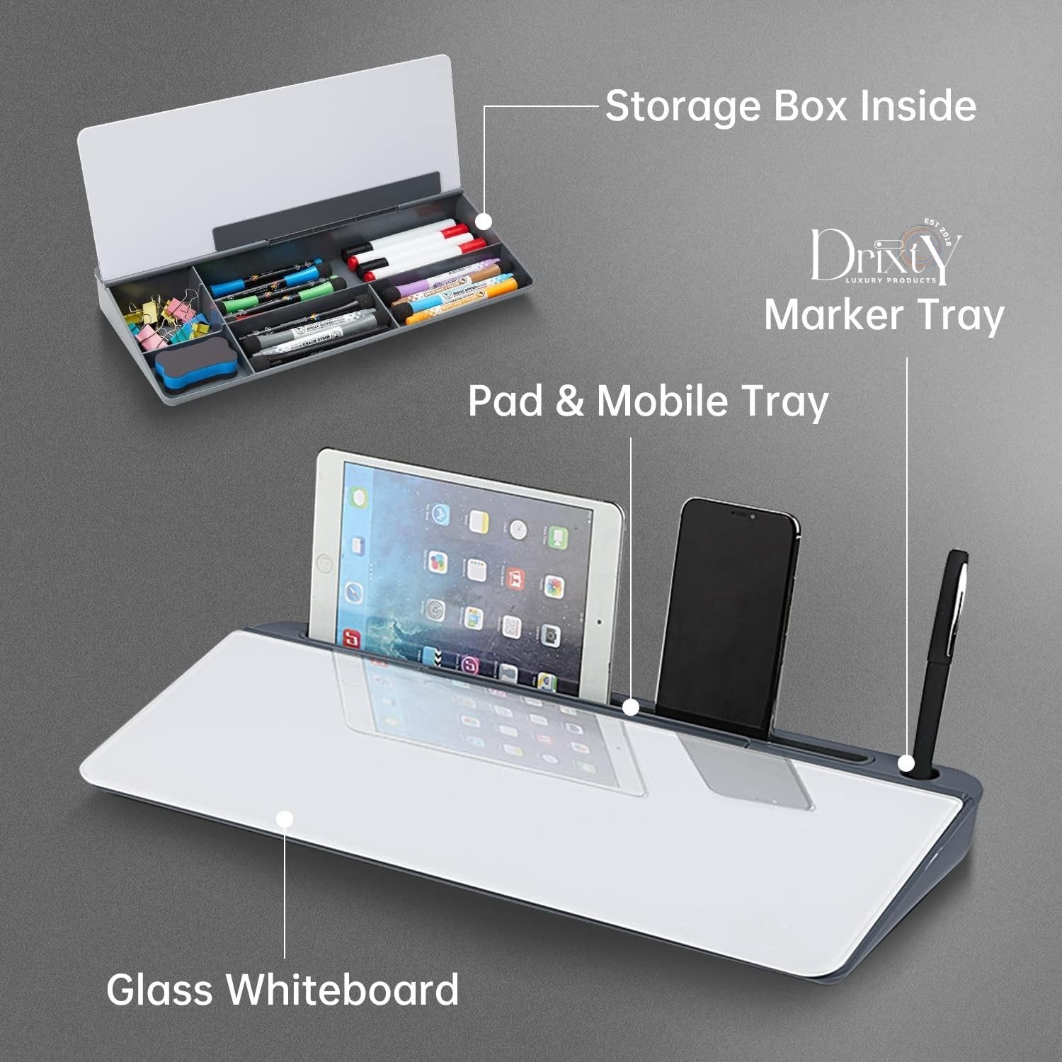 Smart Whiteboard is the #1 Ultimate tool Unique design brings better products. Focusing on professionalism is our brand mission. to stay on top of your to-do list, increase productivity, and keep your desk clean and organized! The DeskBoard Buddy’s surface is made from an ultra-premium, thick, anti-stain, and scratch-resistant glass panel, perfect for taking notes and erasing them easily when finished. Organize your desk space by storing your pens, pencils, highlighters, rulers, paper clips, staples, and other desktop accessories in the hidden accessory storage compartment. Color: White/Grey Material: ABS + Tempered glass Package: Dry Erase Computer Pad x 1 Marker x 1 Magnetic eraser.